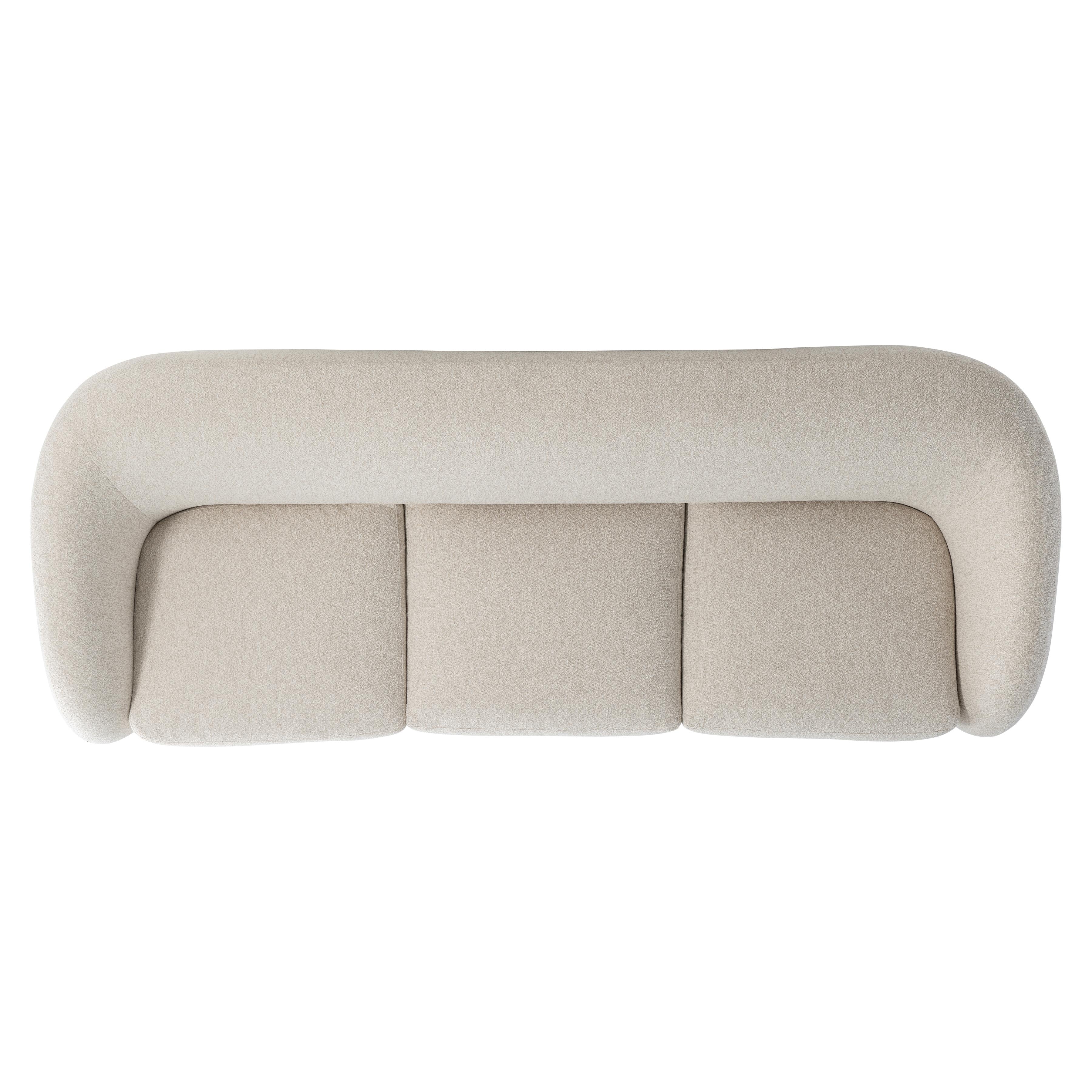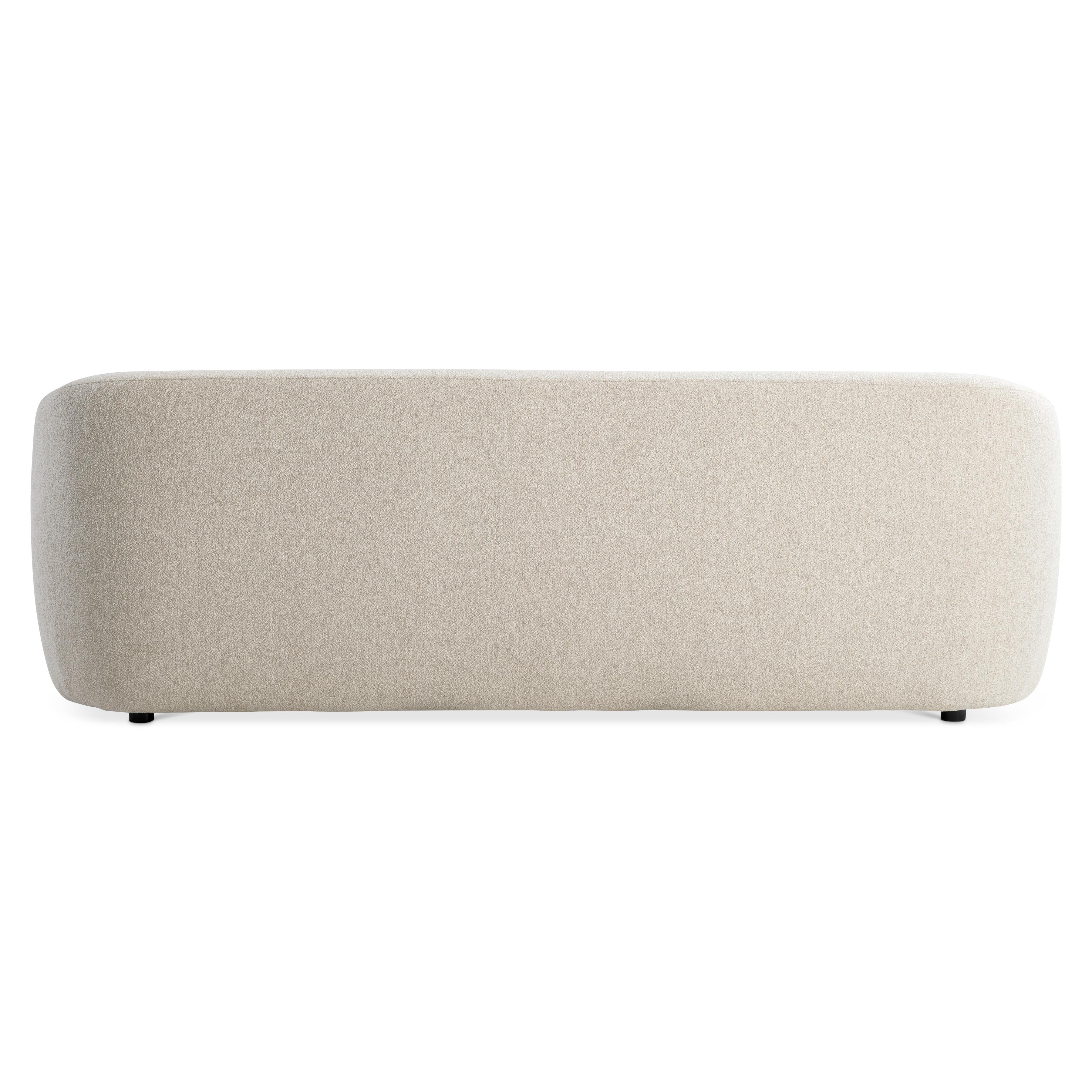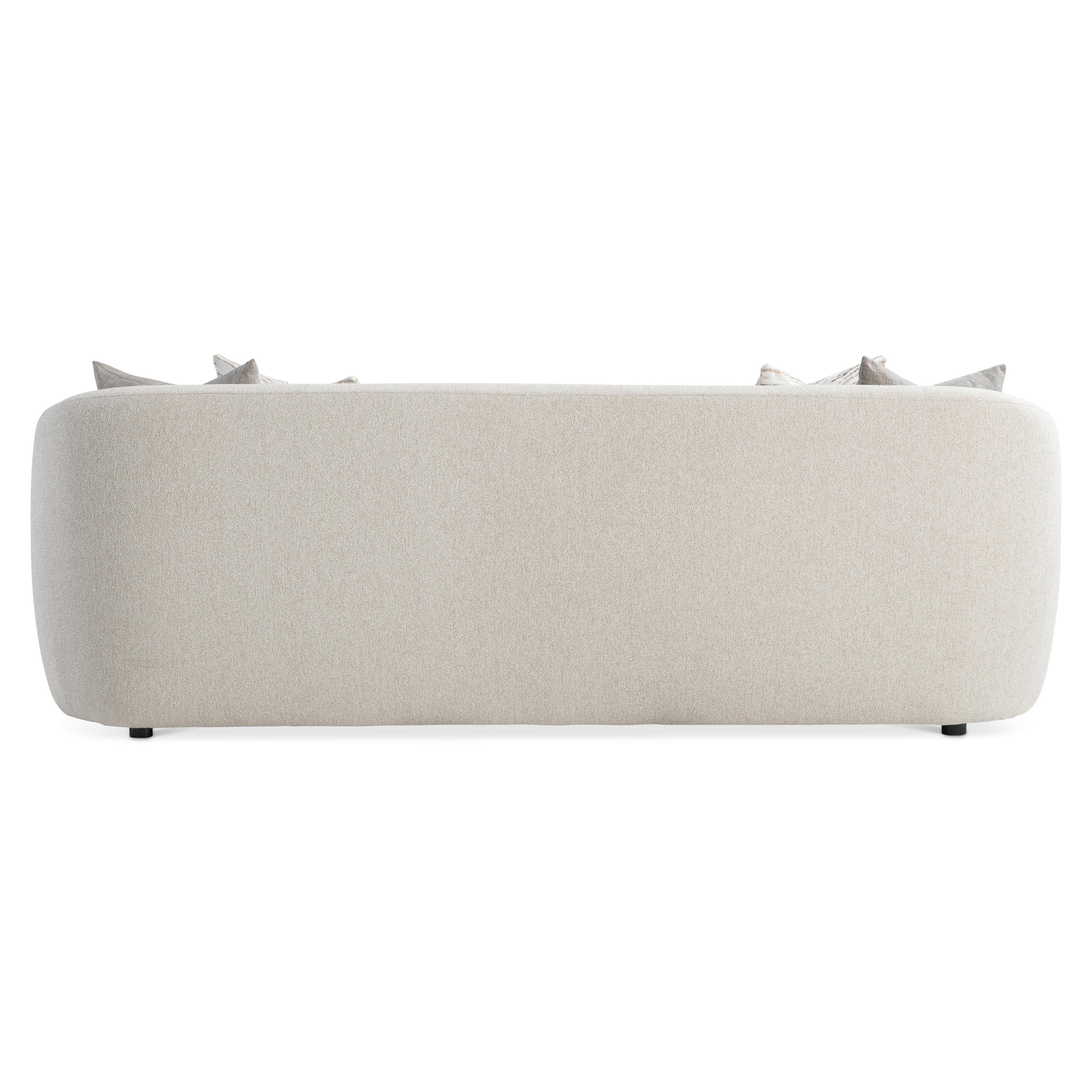 A sheltering back flows around to craft curved arms on this elegant modern sofa.