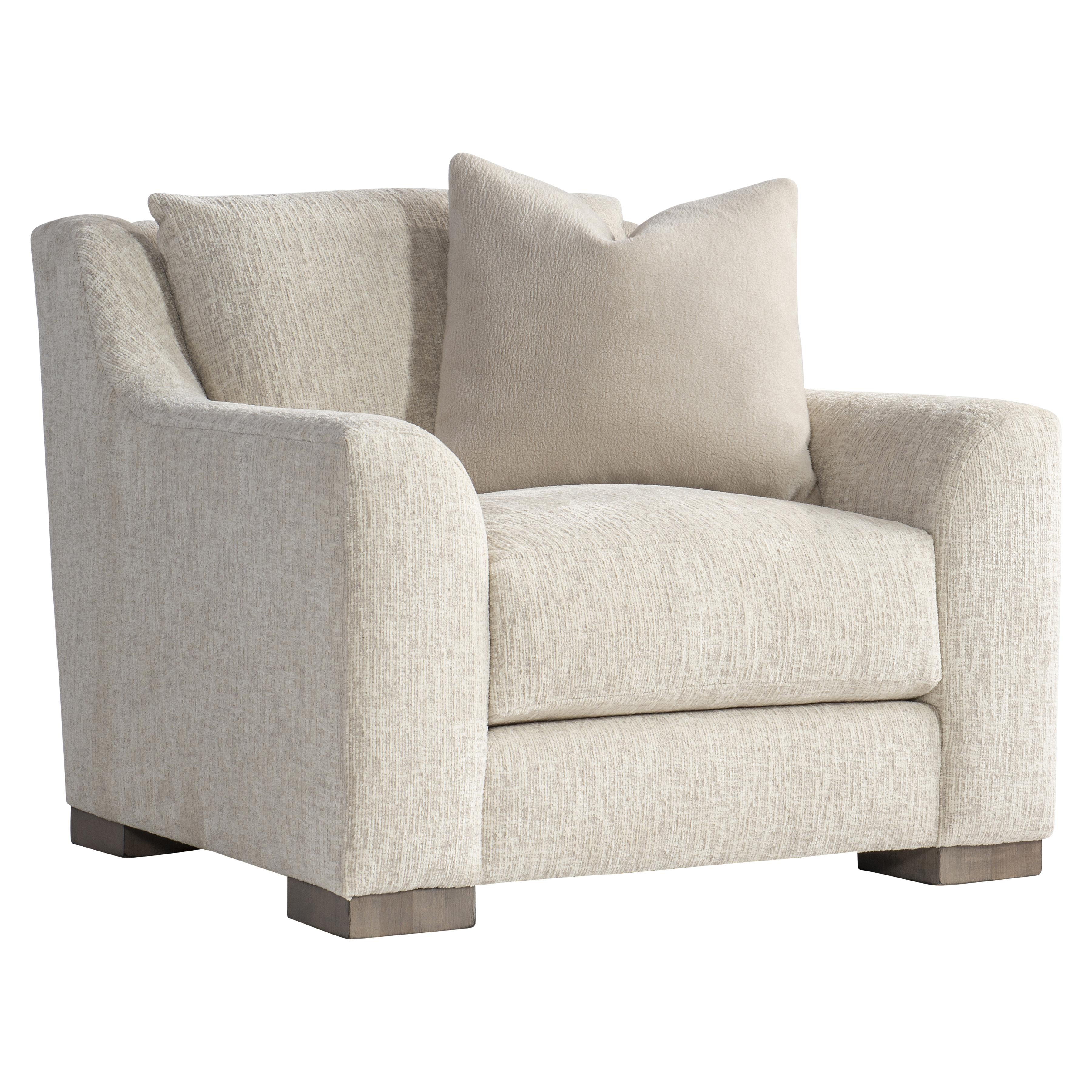 The Gabi fabric chair offers an alluring comfort destination with sweeping lush curves. The oversized arms frame a deep seat and a knife-edge back pillow, along with one (1) curated throw pillow. Exposed wood block feet in Portobello finish support the bold design.