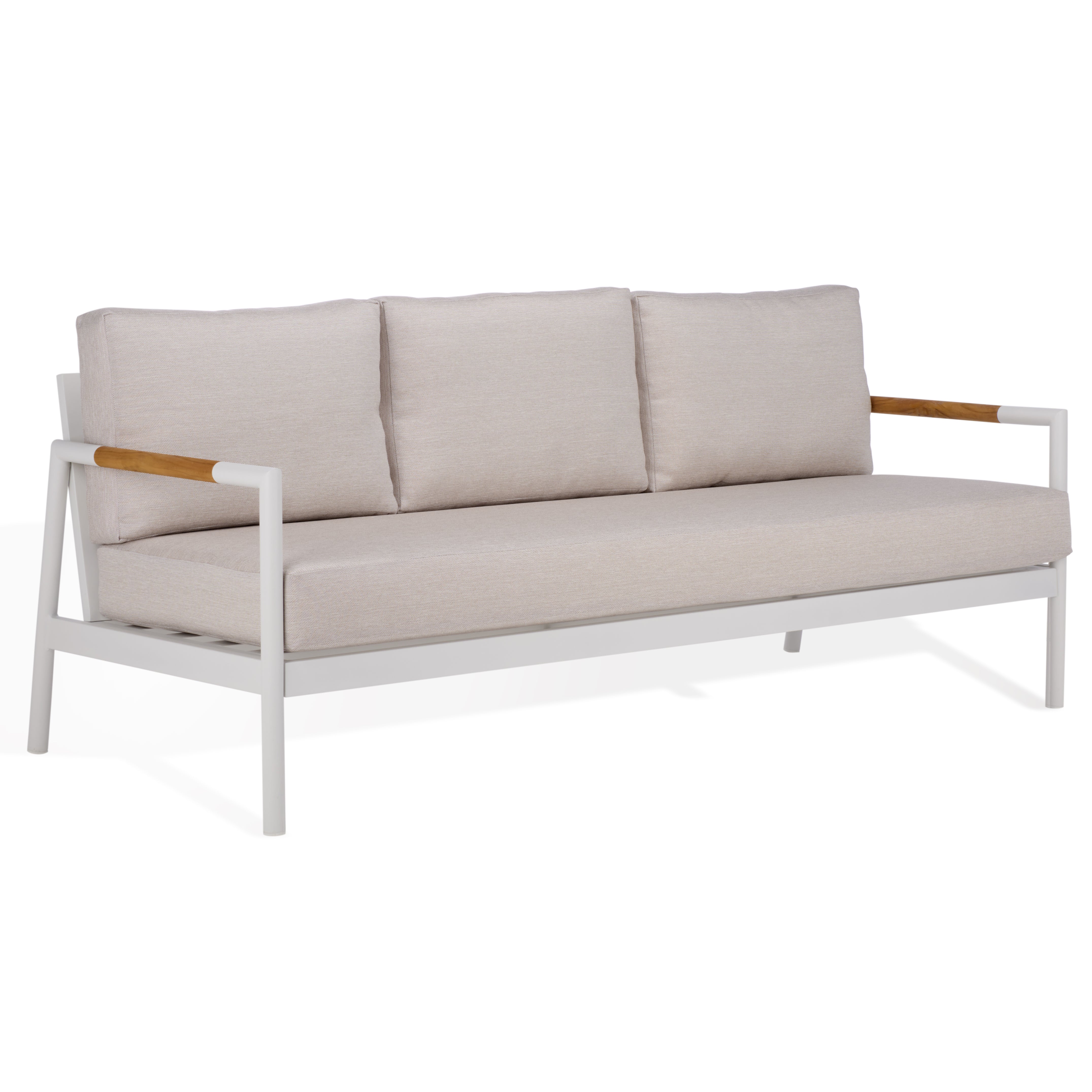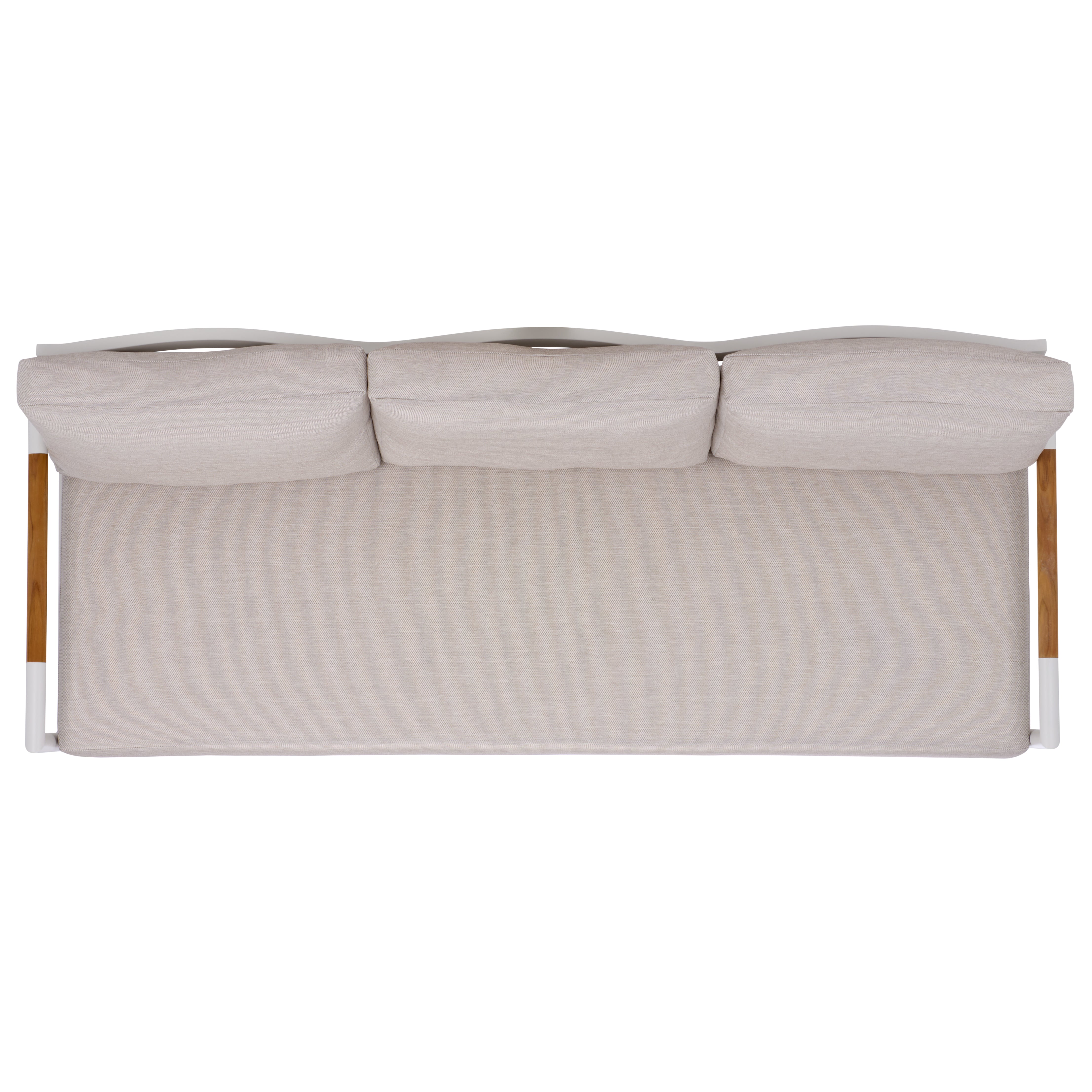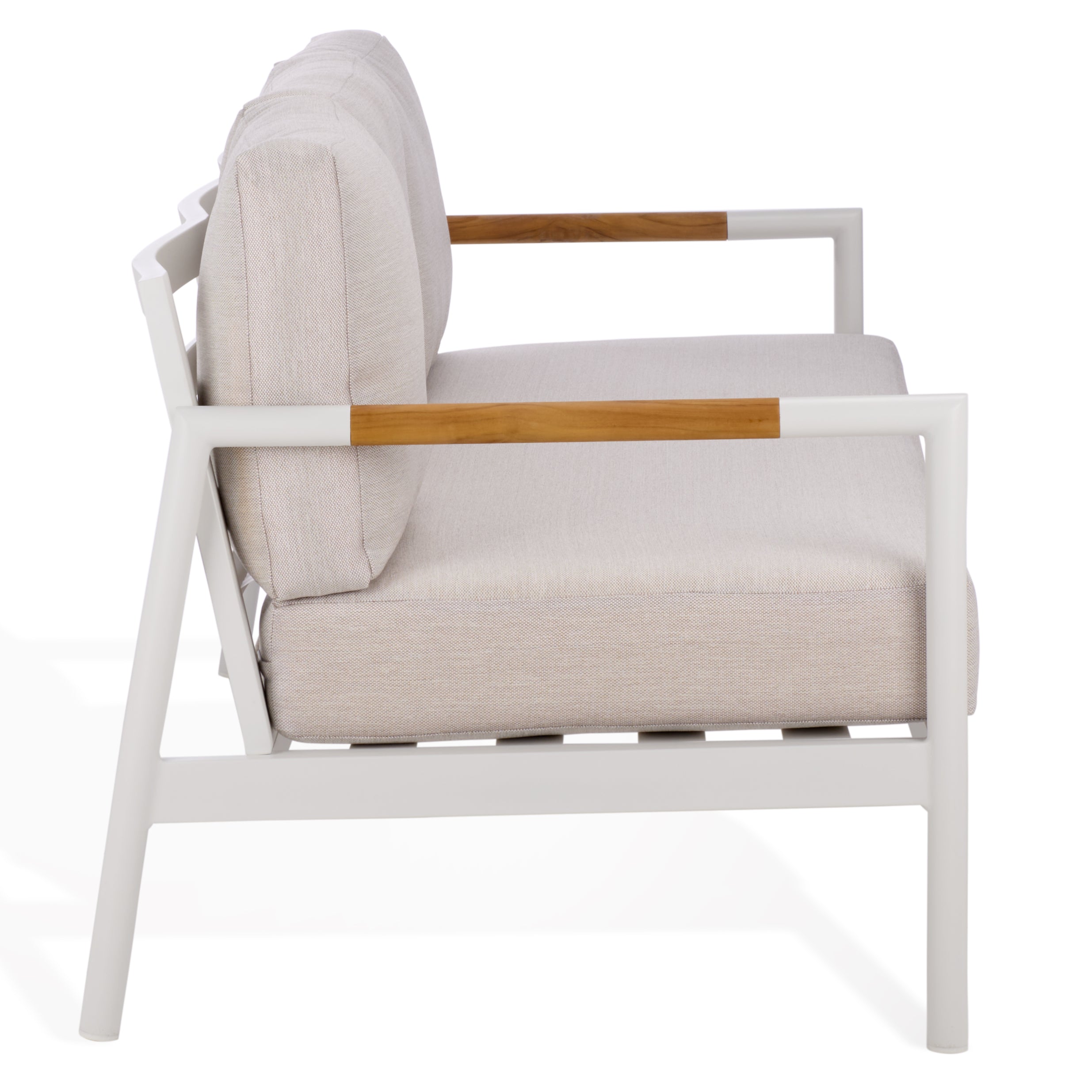 Transform your outdoor space with the Chryssa aluminum and teak patio sofa in white and beige. This elegant piece combines the sleek lines of metal with the warm touch of wood, wrapped in inviting fabric and cozy foam. The soothing color palette of white and beige blends effortlessly into any setting, providing a perfect backdrop for relaxation or social gatherings. The sturdy construction ensures that this sofa delivers both comfort and style. Complement your garden or patio with a sofa that speaks of calm elegance and functional design. Enjoy leisure and create memories with a touch of sophistication in every detail.
