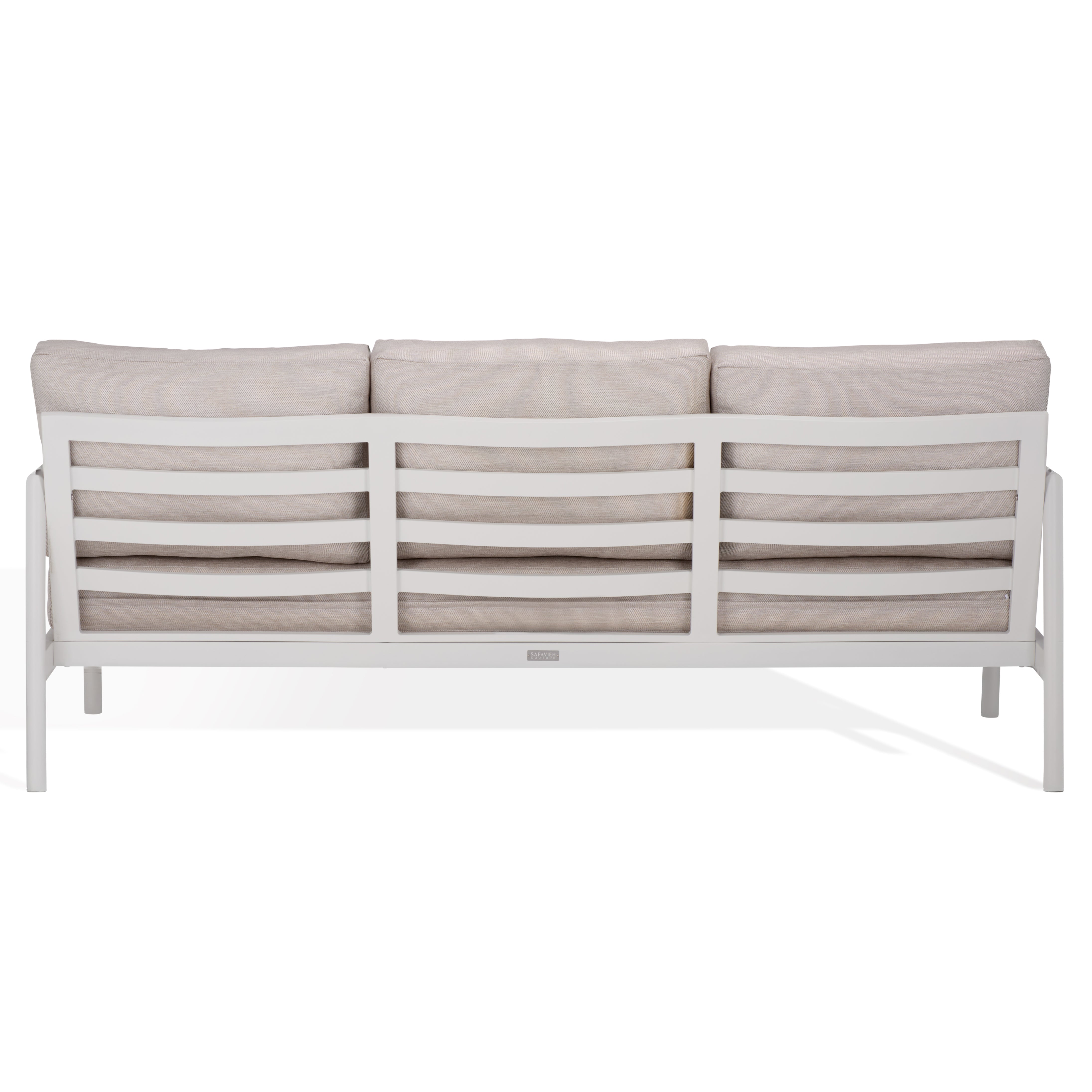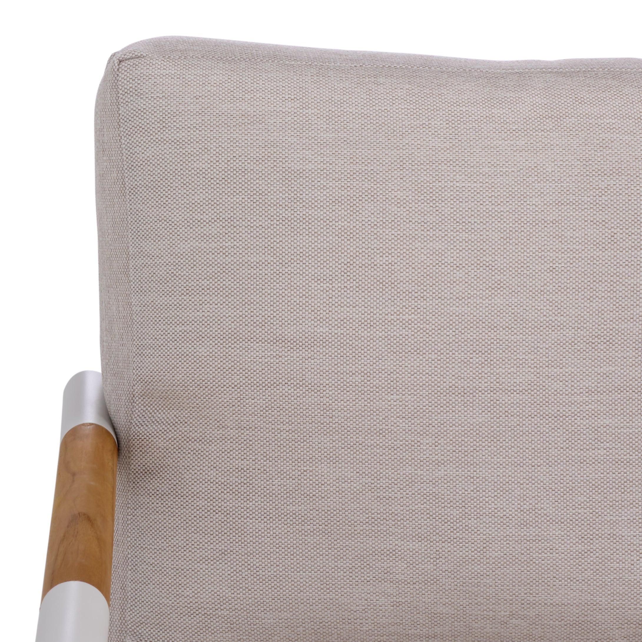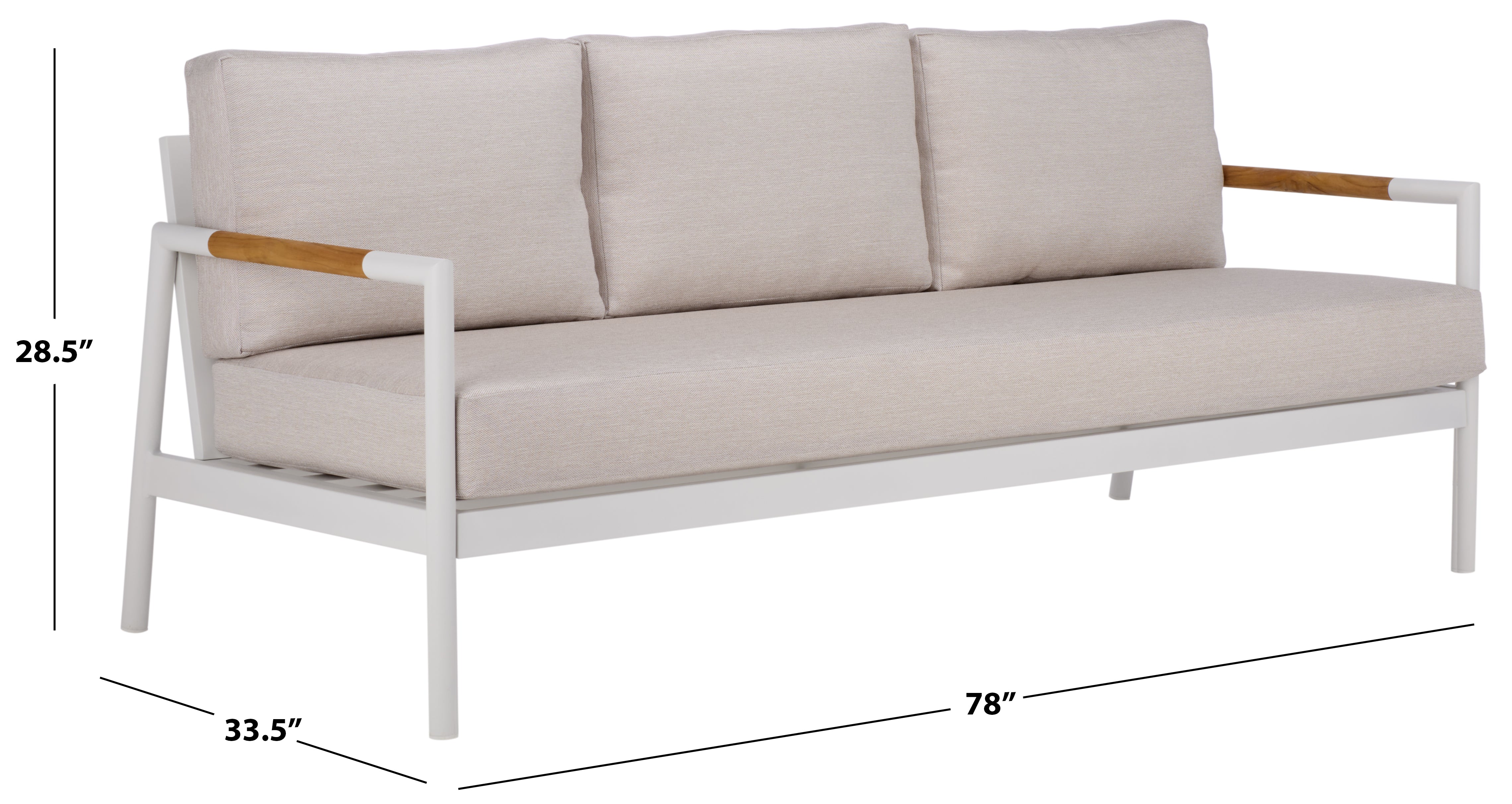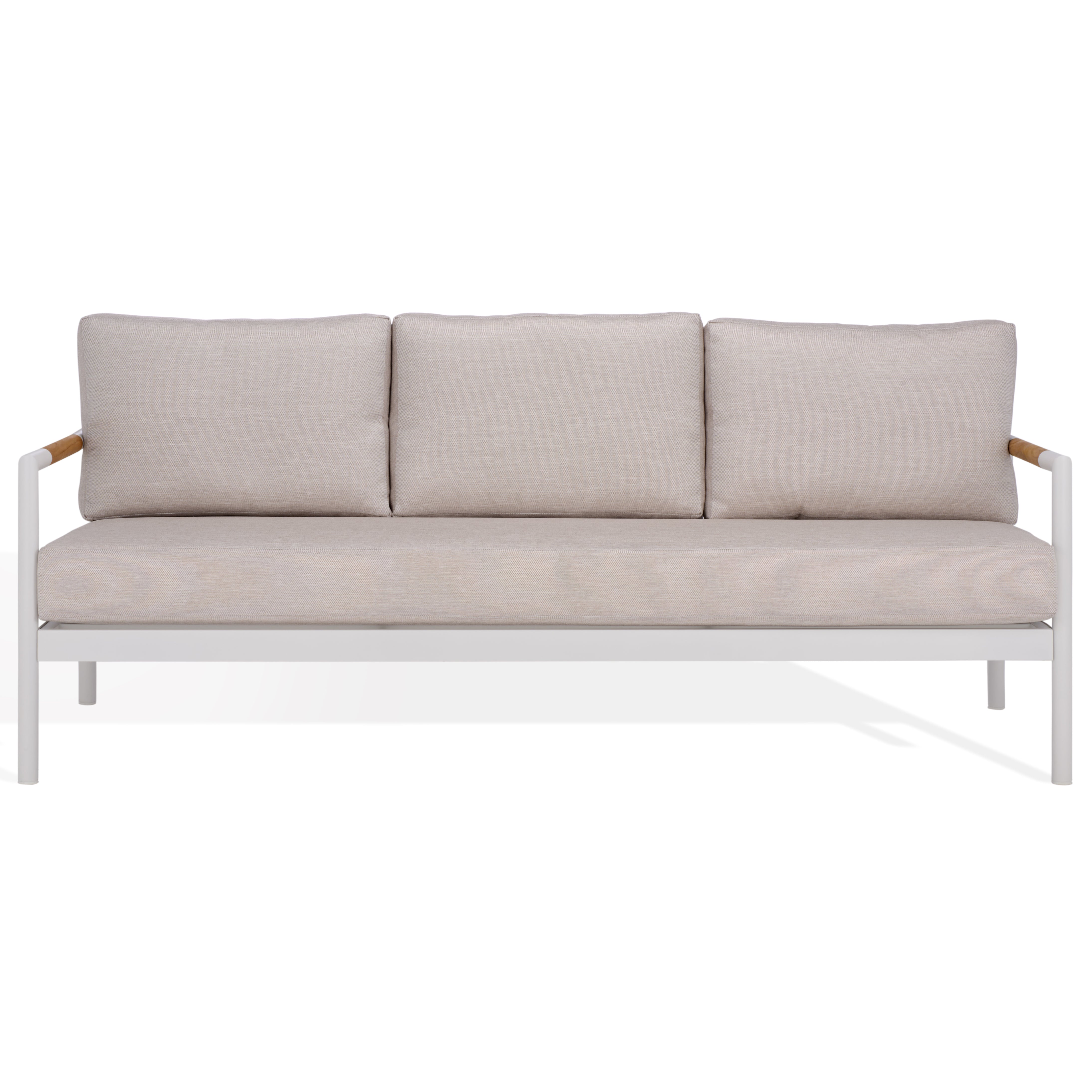 Transform your outdoor space with the Chryssa aluminum and teak patio sofa in white and beige. This elegant piece combines the sleek lines of metal with the warm touch of wood, wrapped in inviting fabric and cozy foam. The soothing color palette of white and beige blends effortlessly into any setting, providing a perfect backdrop for relaxation or social gatherings. The sturdy construction ensures that this sofa delivers both comfort and style. Complement your garden or patio with a sofa that speaks of calm elegance and functional design. Enjoy leisure and create memories with a touch of sophistication in every detail.