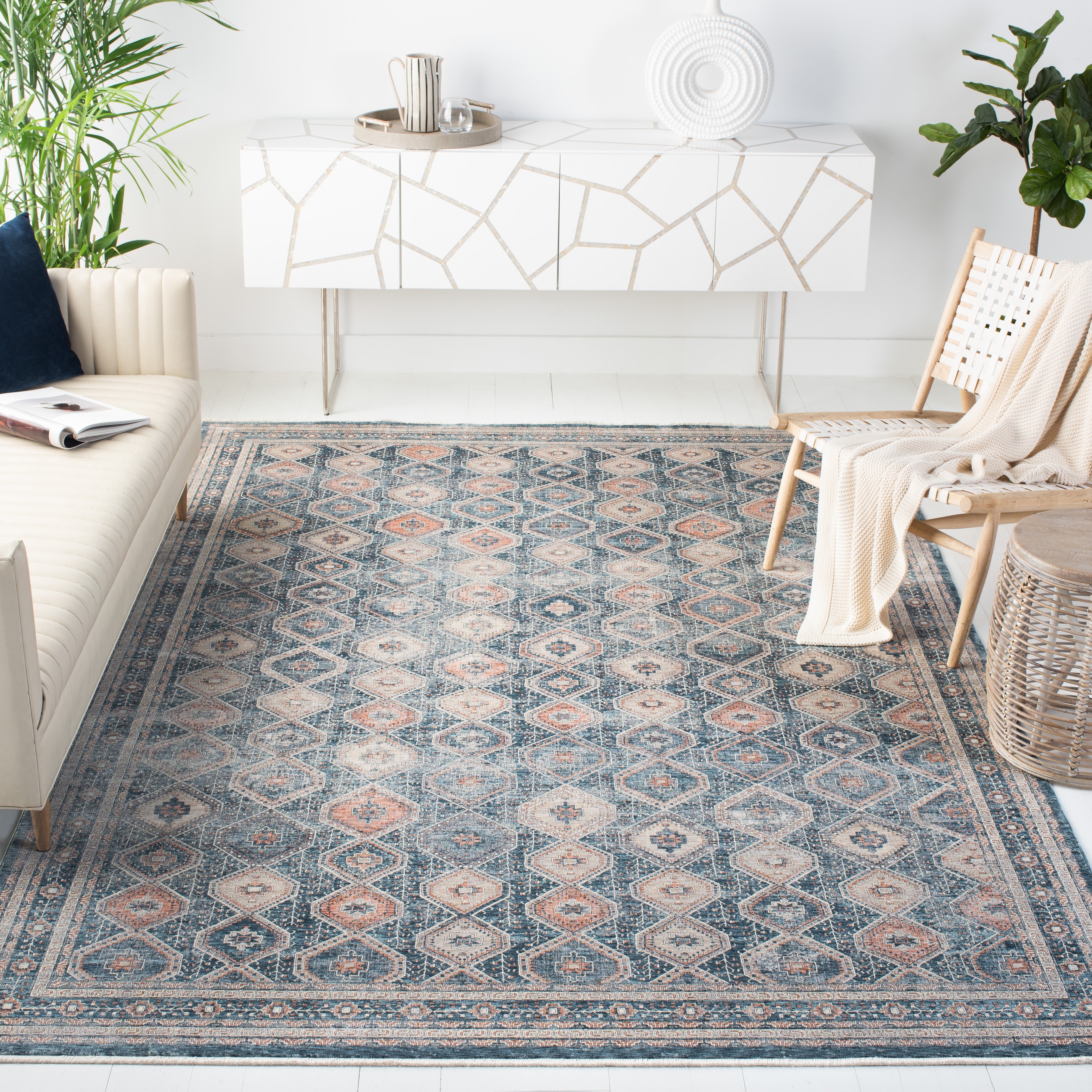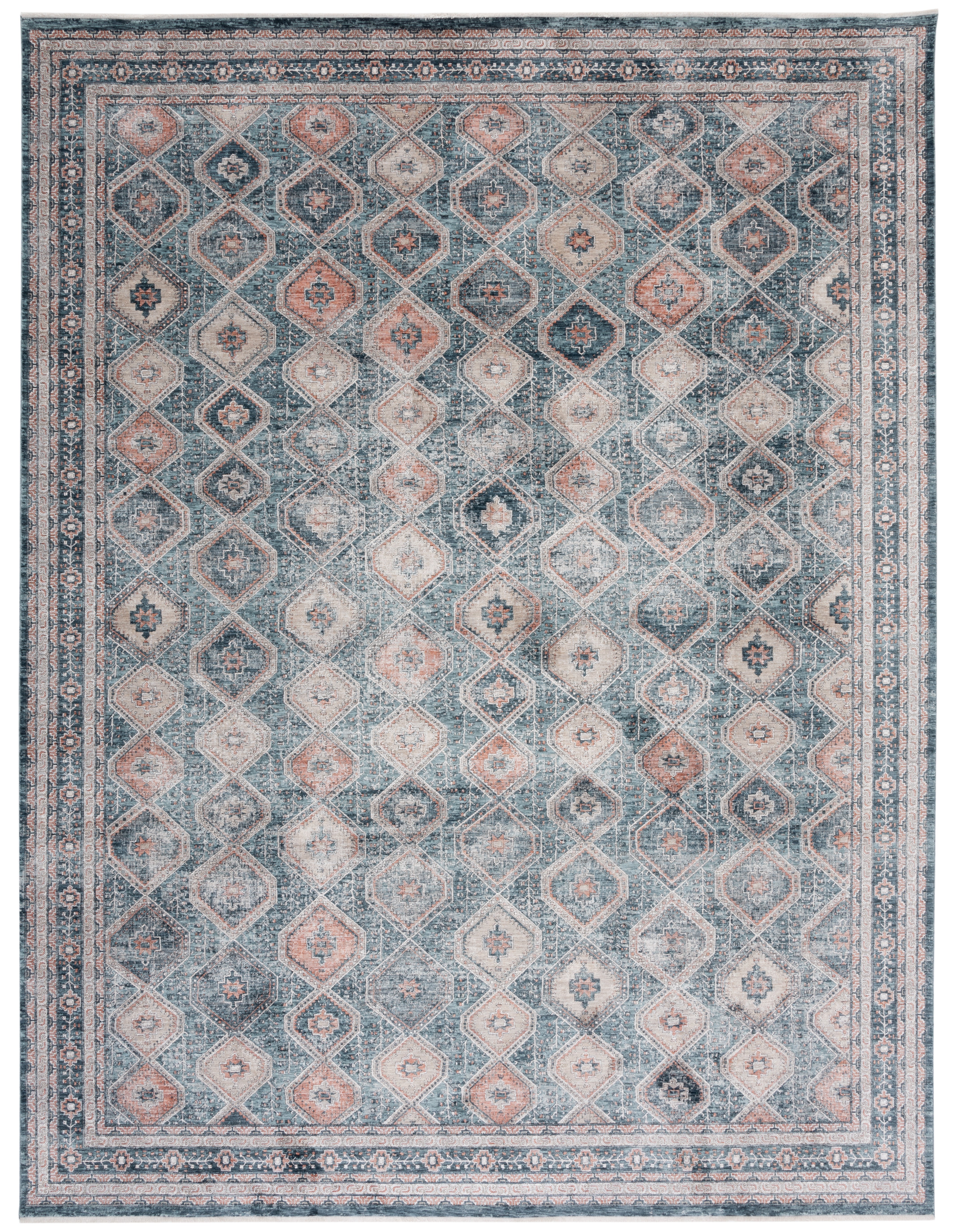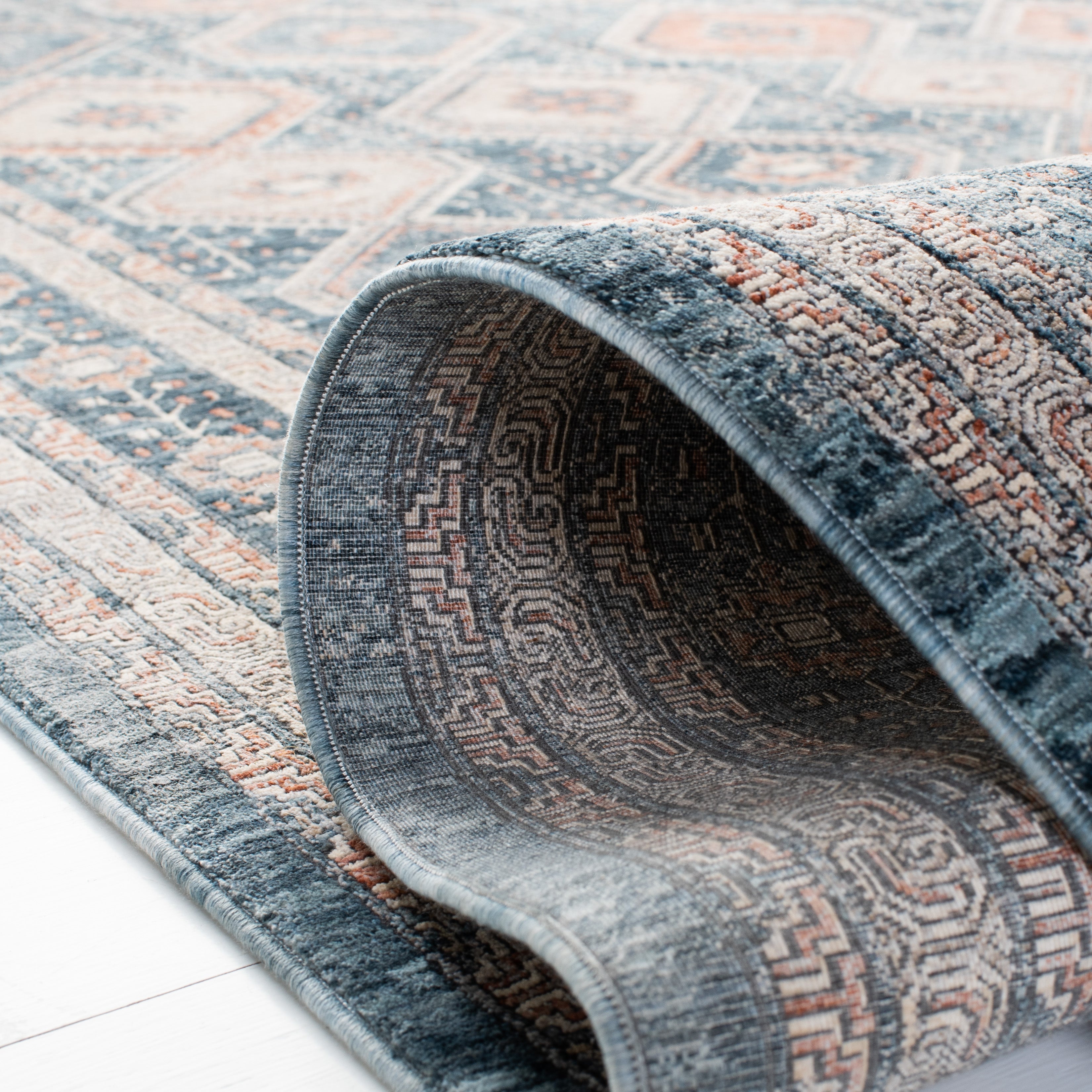 The rug displays a harmonious Transitional style, easily blending with both classic and contemporary decors. The intricate design features a diamond lattice pattern with floral motifs, adding a touch of sophistication and visual interest to your floors. The appealing color palette combines soothing blues with warm ivory accents, creating a tranquil yet inviting atmosphere in any room.