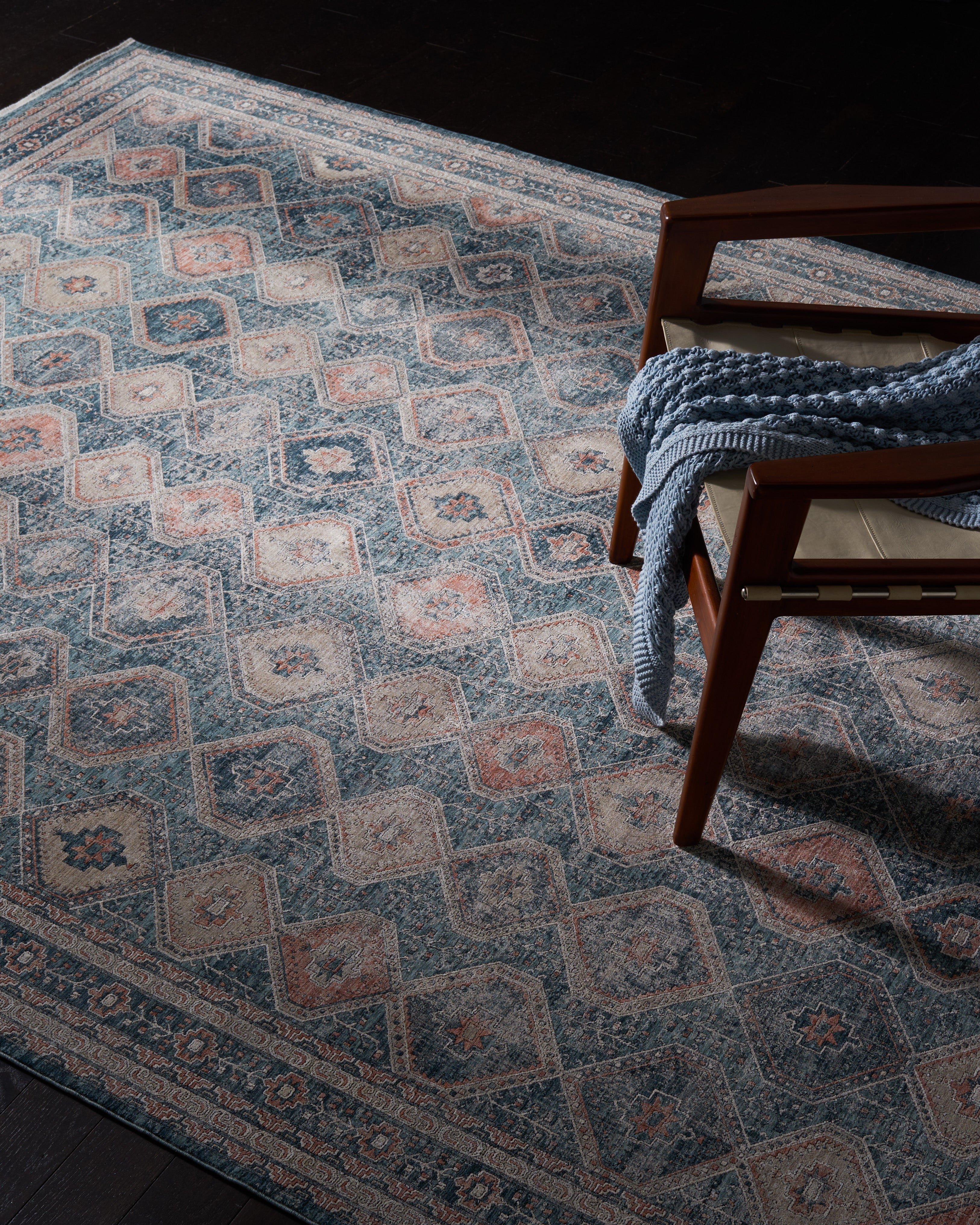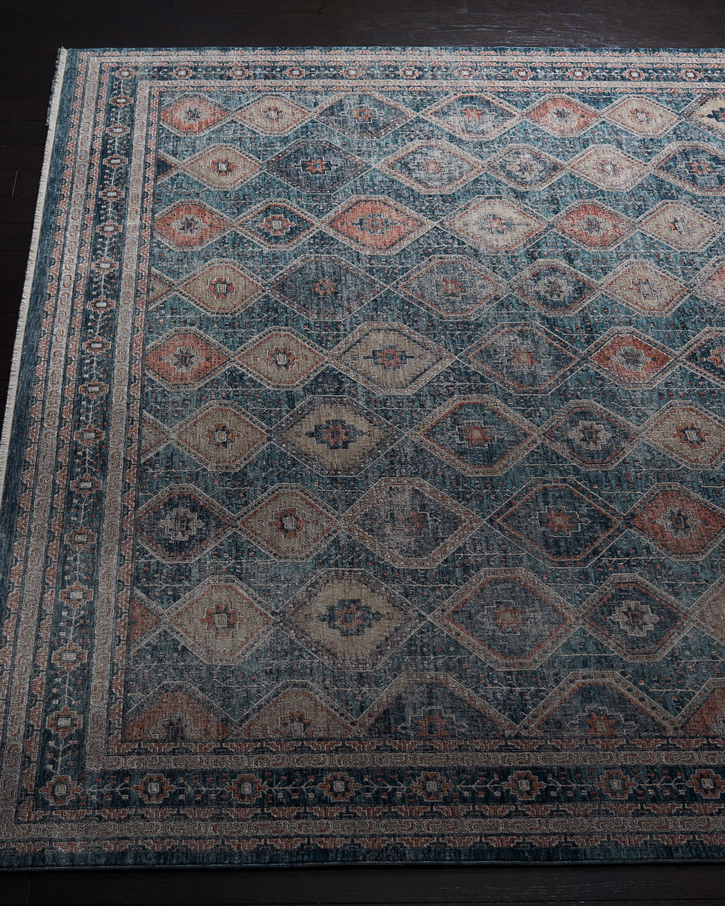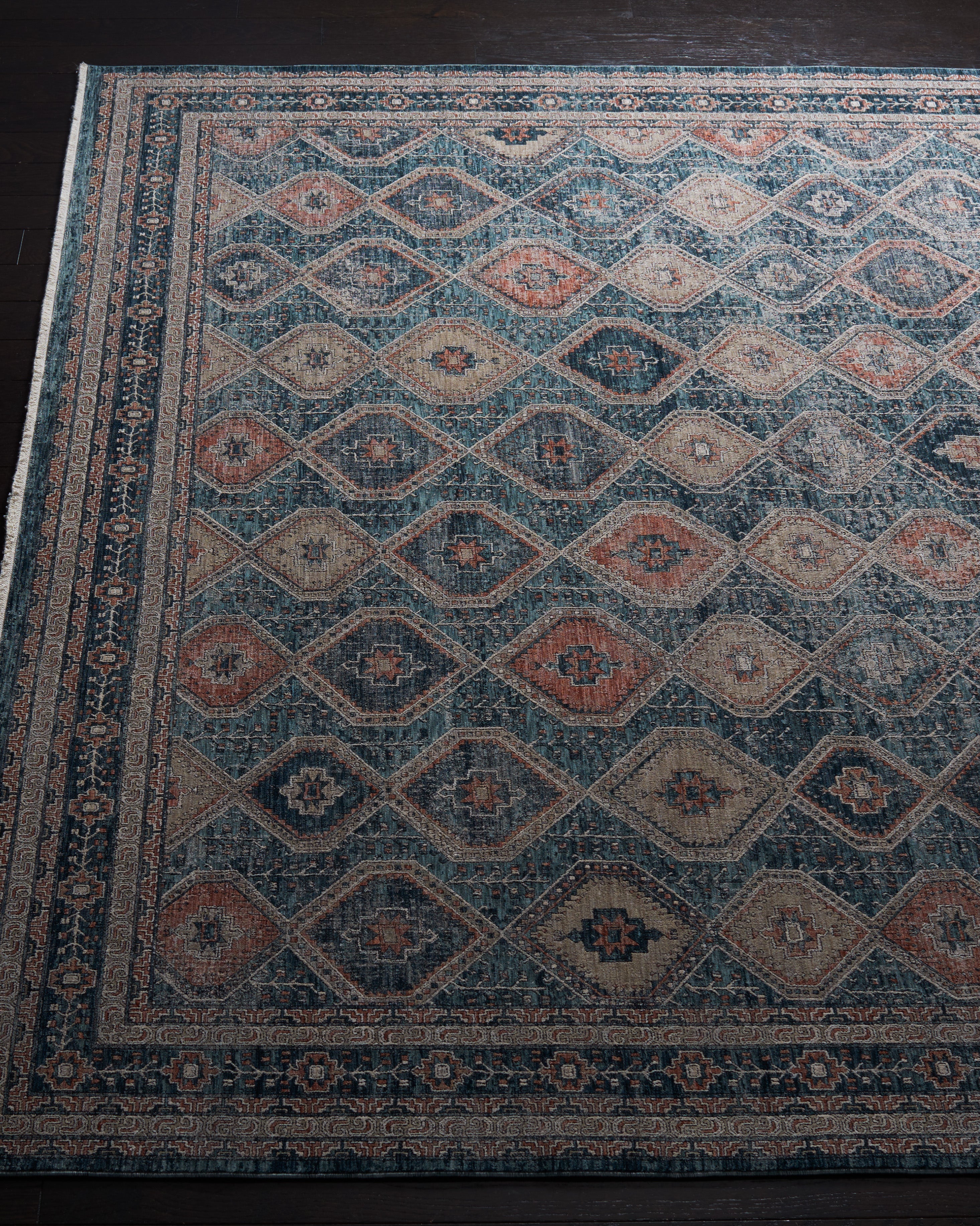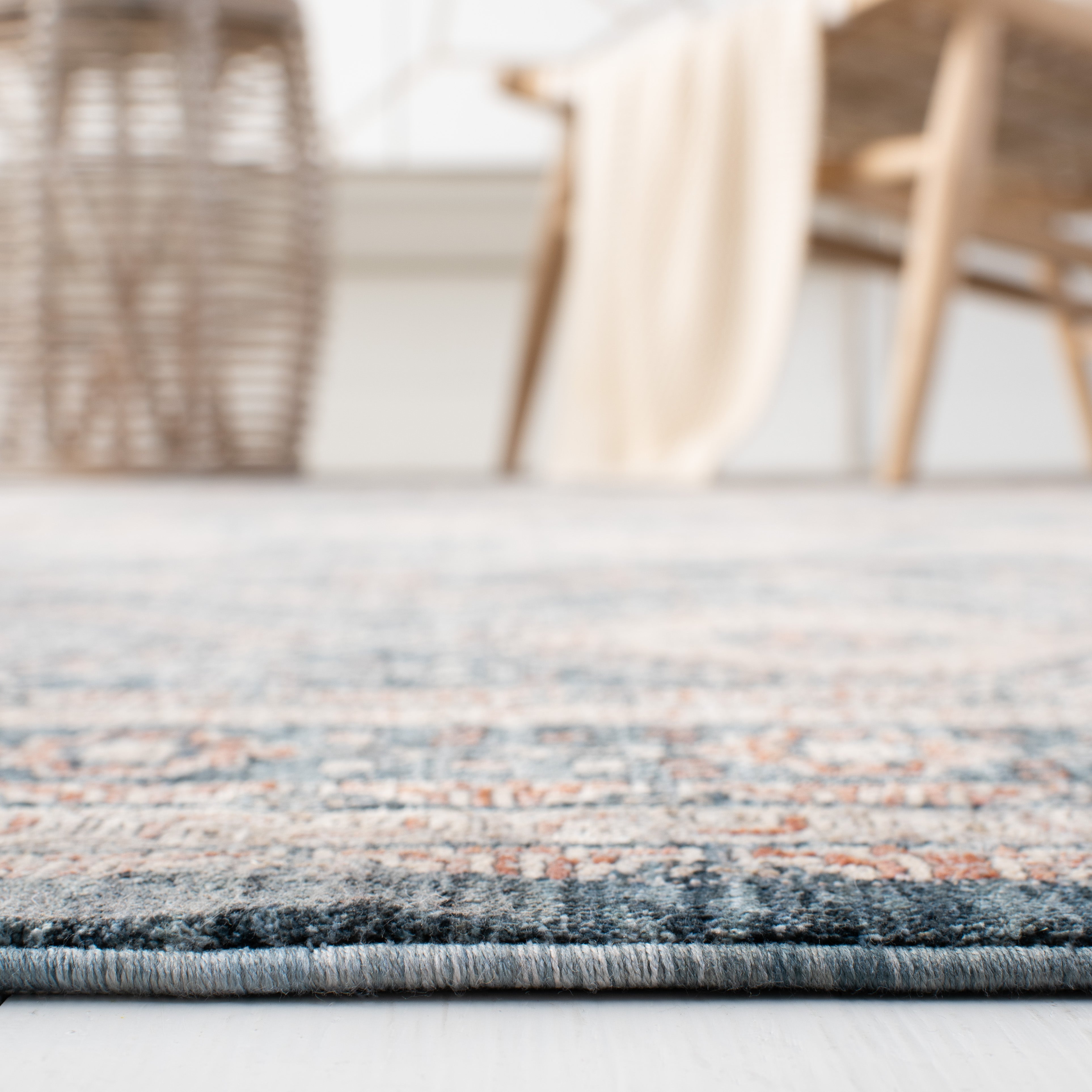 The rug displays a harmonious Transitional style, easily blending with both classic and contemporary decors. The intricate design features a diamond lattice pattern with floral motifs, adding a touch of sophistication and visual interest to your floors. The appealing color palette combines soothing blues with warm ivory accents, creating a tranquil yet inviting atmosphere in any room.